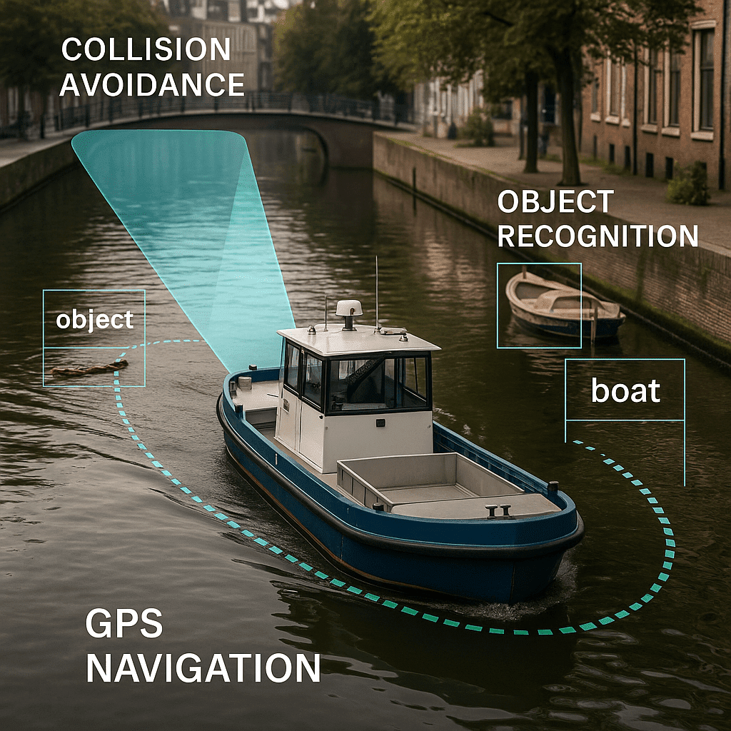 Navigation algorithms then compare this model with the planned route. When an obstacle appears, a buoy, moored boat or drifting log, the collision avoidance logic calculates the safest deviation and adjusts thrust and steering instantly. The system keeps the vessel efficient, balanced and always on course.
